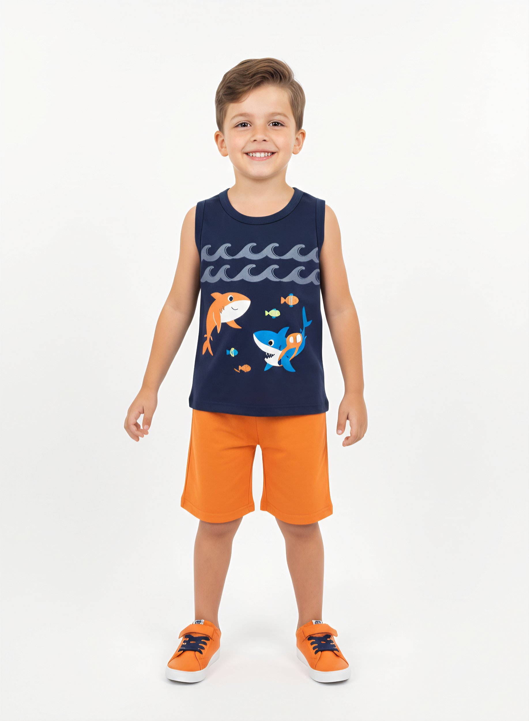A regata em meia malha possui uma cor azul-marinho profunda, servindo de cenário para uma estampa divertida de tubarões amigos e ondas estilizadas. A bermuda em moletom sem felpa, na vibrante cor laranja, cria um contraste moderno e alegre, garantindo liberdade total de movimentos para brincar, correr e se divertir.