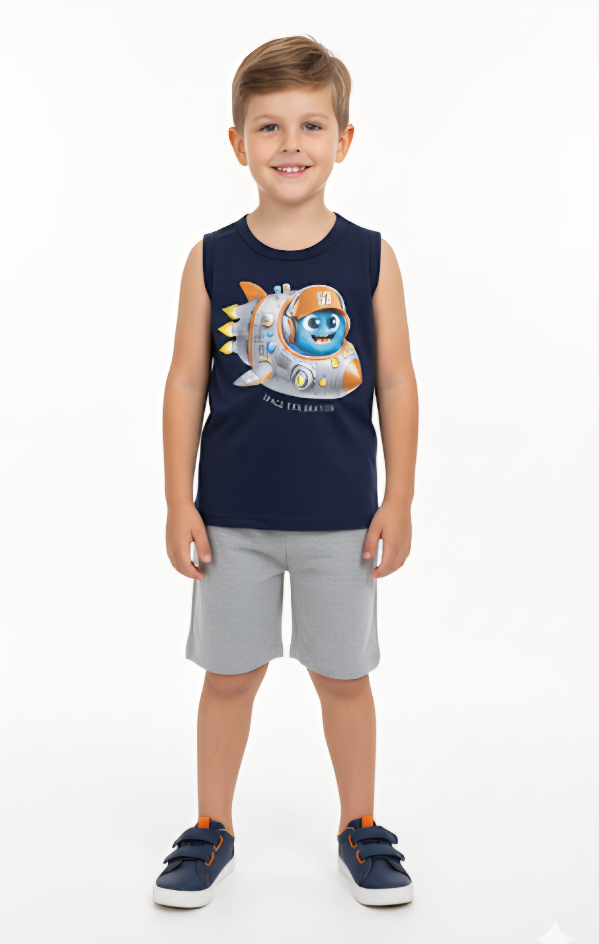 Este conjunto é a escolha perfeita para pequenos exploradores que não param um segundo! Unindo o estilo lúdico do espaço com o máximo conforto para os dias de calor.